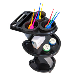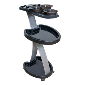 Carro ayudante / tintorero para peluquería color negro y gris.Incluye 3 pocillos para tinte y una sección para aluminio. 3 Bandejas de plasico en distintos niveles para que coloques todos tus implementos.