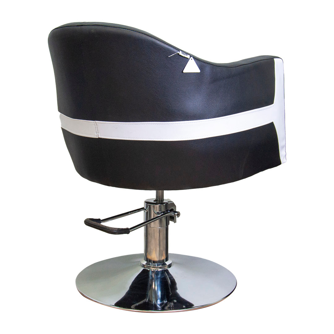 El Sillón de corte hidráulico “Milano" es negro con una franja blanca que lo recorre. Es totalmente acolchado con tapiz de alto tráfico y poliuretano de alta densidad con tapiz inyectado y base de estrella pulido Bruñido.Dimensiones:
