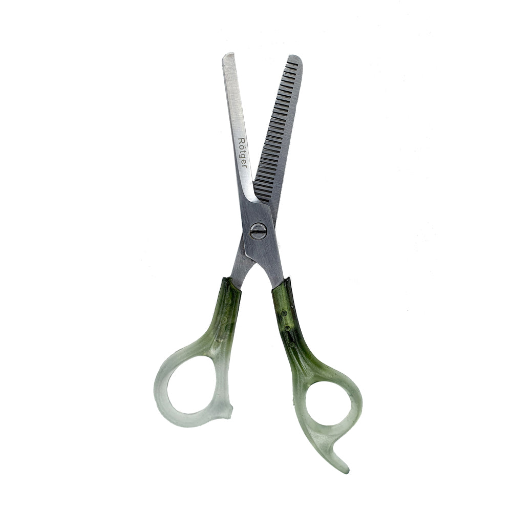 Tijera esculpidora Rotger con mango verde plástico, ideal para estudiantes, principiantes o uso personal.