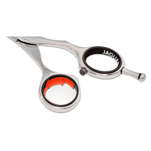 El EVOLUTION encaja perfectamente en la mano gracias a la forma ergonómica del mango. Además, el ojo del pulgar está inclinado para que sea posible un trabajo relajado. JAGUAR también concede especial importancia a los anillos de inserción de dedos de alta calidad. El sistemade tornillo SMART SPIN plano de estas tijeras para el cabello permite un ajuste preciso de la generosidad. Si el engranaje está configurado correctamente, solo se requiere un mínimo de presión al cerrar las tijeras. Por lo tanto, se garantiza una apertura y cierre suaves y un corte suave.